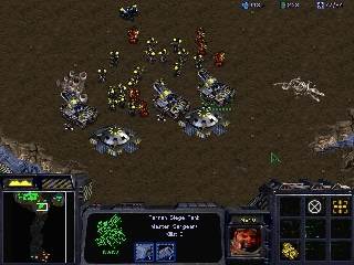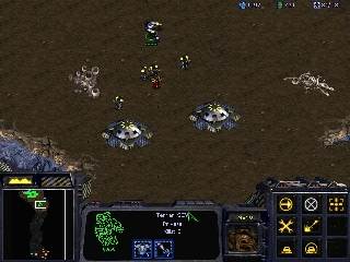 第三段階 次は当然飛行ユニットで来るので、ミサイルやGoliathなどで対空防御も追加しよう。(画像にはGoliathは無いけど) 地上からの支援の無い飛行ユニットなど恐れるに足りないが、ZergのGuardianだけは防げないので、WraithやMarineで積極的に倒そう。 Cloakするユニットが来るのでMissileは必須だが、Ghostが登場するころにはScience Vesselも置いておこう。 |