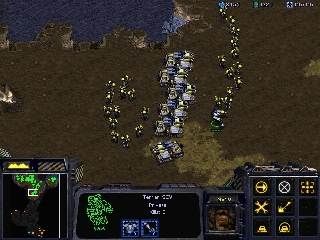 Marine12を部隊1(cntl-1),TANK6を部隊2,Marine12を部隊3,SCVを1人。これで1部隊を構成する。移動時は、部隊1の後を部隊2,その後を部隊3とSCVがついていくようにして、部隊1のみコントロールする。こうすると対空や近接に弱いTANKをMarineでサポートすることができる。SCVはメンテナンスや拠点防衛のためのMissile作成用に1人連れていくと便利。敵に接触するちょっと手前で止まって、TANKをSiegeモードにしてから部隊1のMarineをじわじわ進めて視界を確保する。恐ろしいことにMarineが近接攻撃をくらうと、TANKはMarineごと吹き飛ばすので注意。TANKを3台づつTANKモードにしてはちょっと前に出してSiegeモードにするなどして前進してもよい。2ndくらいだったら大体これで落とせるが、敵の部隊に対応して必要な増援を行う。例えばCloak
