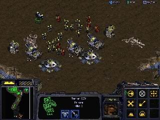 第三段階 次は当然飛行ユニットで来るので、ミサイルやGoliathなどで対空防御も追加しよう。(画像にはGoliathは無いけど) 地上からの支援の無い飛行ユニットなど恐れるに足りないが、ZergのGuardianだけは防げないので、WraithやMarineで積極的に倒そう。 Cloakするユニットが来るのでMissileは必須だが、Ghostが登場するころにはScience Vesselも置いておこう。 |